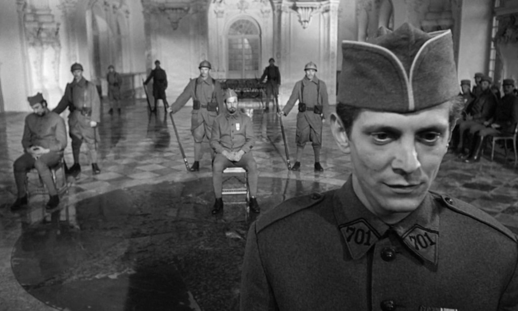 Even though it doesn’t look like a Kubrick film at first, you are soon going to experience wonderful scenes and framings, especially illustrated by the famous shot of walking through the trenches. For the construction of the battlefield, Kubrick hired 5000 square yards of land, and it took him a month to film the initial assault. There is a huge difference between life in the trenches and life in the command. Trenches are filled with dust, mud, and despair, while high-ranking officers enjoy meals and aristocratic balls at a nearby chateau. The castle seems so empty and huge, especially when there’s a trial happening there, confining its characters not with the lack of space but the vastness of it. Kubrick is picturing the emptiness surrounding the officers on trial, contrasted with the cramped life in trenches, suffocating the audience as well. The musical score by Gerald Fried also creates a sense of realism. There are war-like drums being played at the beginning of the film and during the execution. But the lack of score creates an atmosphere as well. When you are ordered to win an impossible battle, there is no need for nothing more than silence, adding to the sheer rawness of the situation.